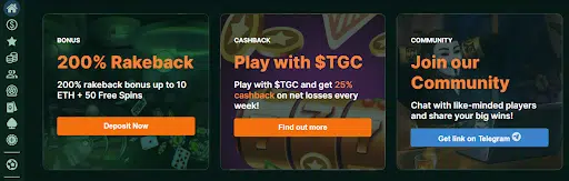 New players at TG.Casino can claim a 200% welcome bonus of up to 10 ETH. The bonus is released incrementally as players wager six times their initial deposit, offering 10% in cash each time.