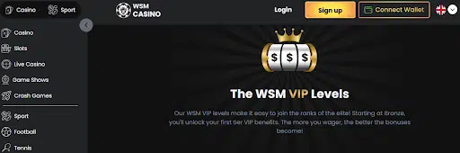 WSM Casino also offers a VIP program with perks like up to 25% weekly cashback, up to $100,000 in weekly bonuses, and exclusive free spins. Players can level up through four VIP tiers (Bronze, Silver, Gold, and Platinum) unlocking greater rewards and benefits as they wager more. VIPs enjoy fast withdrawals, special rewards, and a dedicated account manager. To start, all you have to do is simply deposit and wager to climb the ranks for more personalized offers.