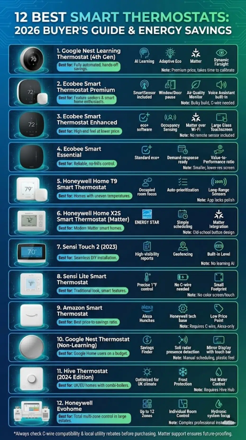 | Model | Price Range | ENERGY STAR | C-Wire Required | Matter Support | Best For |