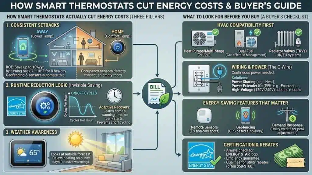 A Note on Savings: ENERGY STAR certification for smart thermostats is unique because it’s based on real-world field data. On average, certified models save users about 8% on heating and cooling (roughly $50/year). However, results vary significantly based on your climate and how aggressively you use “Away” modes.