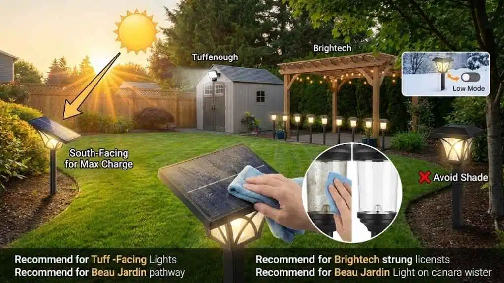In the winter, the sun is lower and the days are shorter. If your lights have a “Low” or “Eco” mode, switch to it in November. This reduces the lumen output but ensures the light stays on until morning despite the weaker charge.
