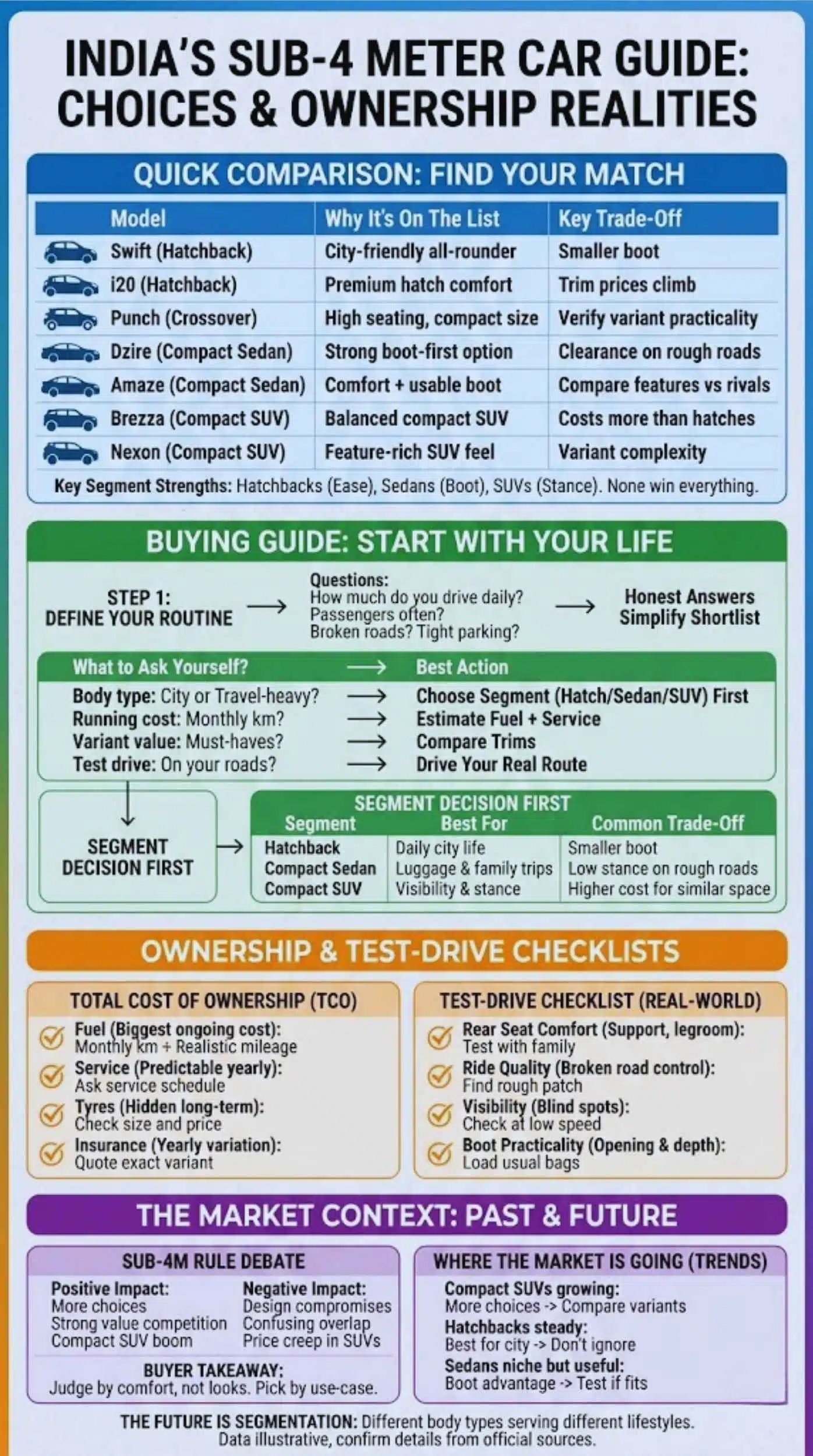 If you are comparing across segments, remember this: hatchbacks win on ease, sedans win on boot, and compact SUVs win on stance. None of them wins everything.