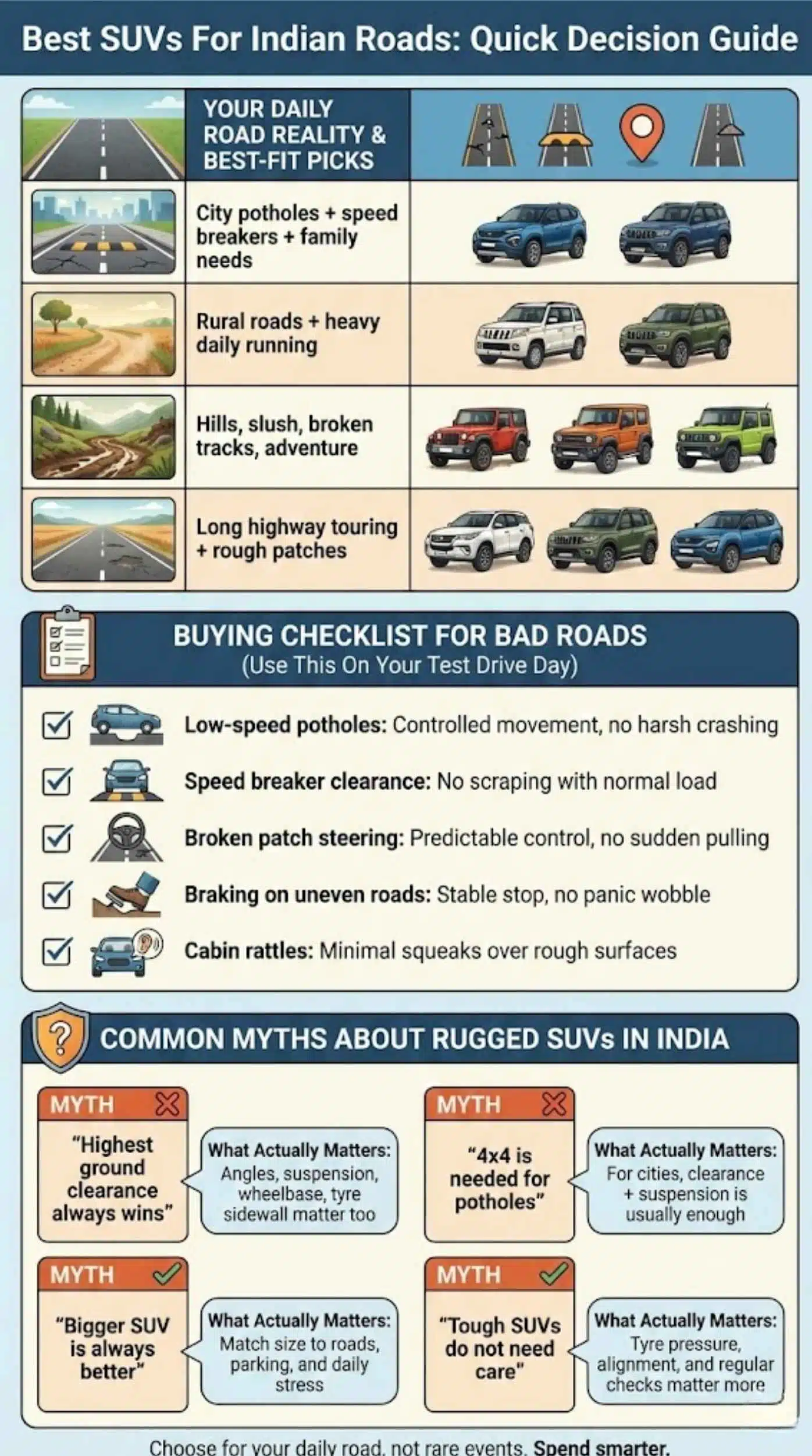 The smartest SUV choice is the one that matches your daily reality. If your roads are mostly broken city patches and speed breakers, comfort and tyres matter most. If your roads include rural ruts, slush, and steep climbs, traction and clearance matter more. If your trips are long and loaded, stability and reliability matter.