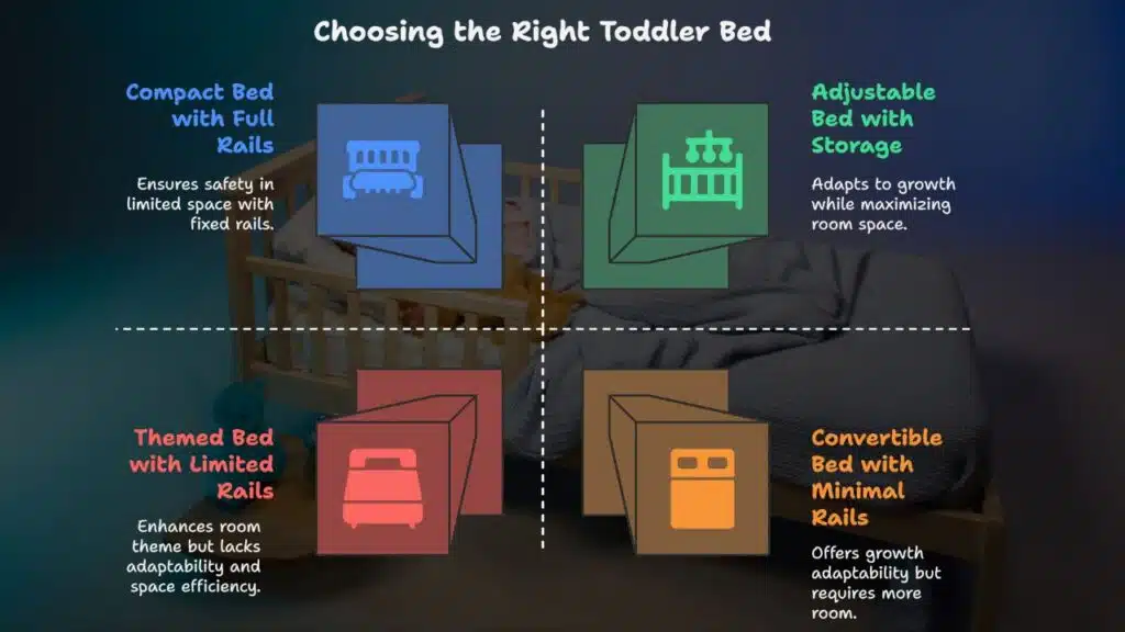 - Your child’s age matters: Younger toddlers (18 months to 2.5 years) benefit from full protective rails. For older toddlers, consider partial or removable rails.