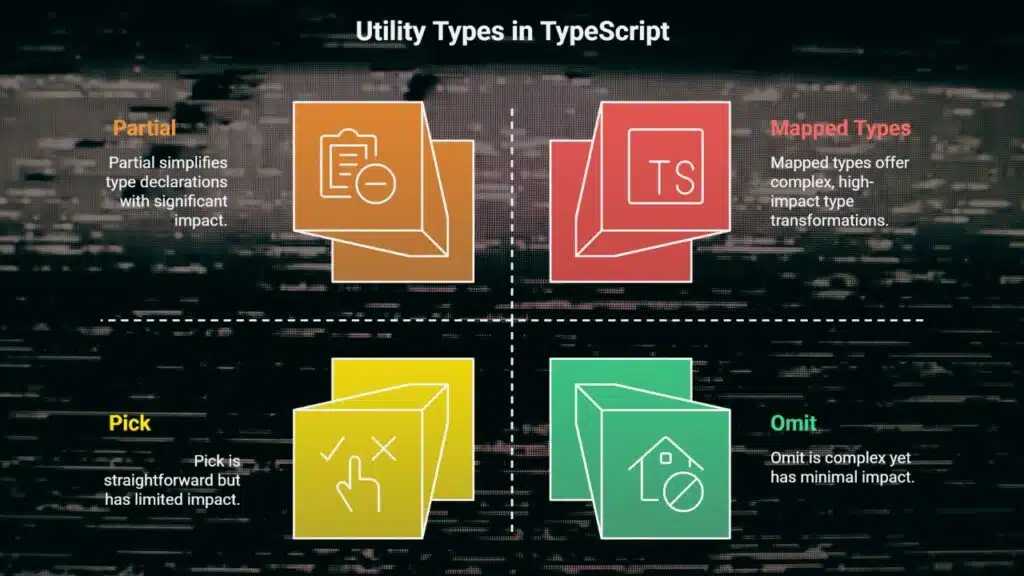 Utility types like Partial let you tweak type declarations fast in TypeScript. Readonly freezes properties so you avoid accidental changes. Pick grabs only the fields you need.