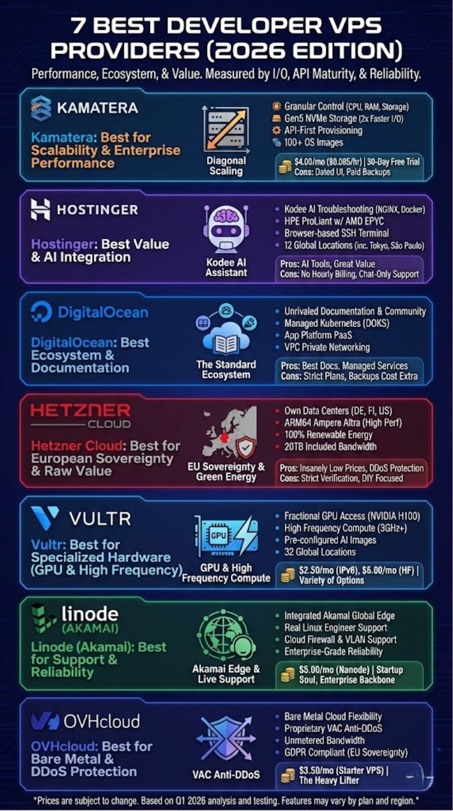 If your priority is raw, unbridled performance for database-heavy applications or real-time processing, Kamatera stands out as the clear technical winner with its Gen5 NVMe architecture. For individual developers, students, and early-stage startups focused on stretching their runway, Hostinger offers a blend of performance and AI-driven innovation that is mathematically impossible to ignore. Meanwhile, DigitalOcean continues to be the safest bet for growing teams that require a mature, well-documented ecosystem that scales predictably without breaking.