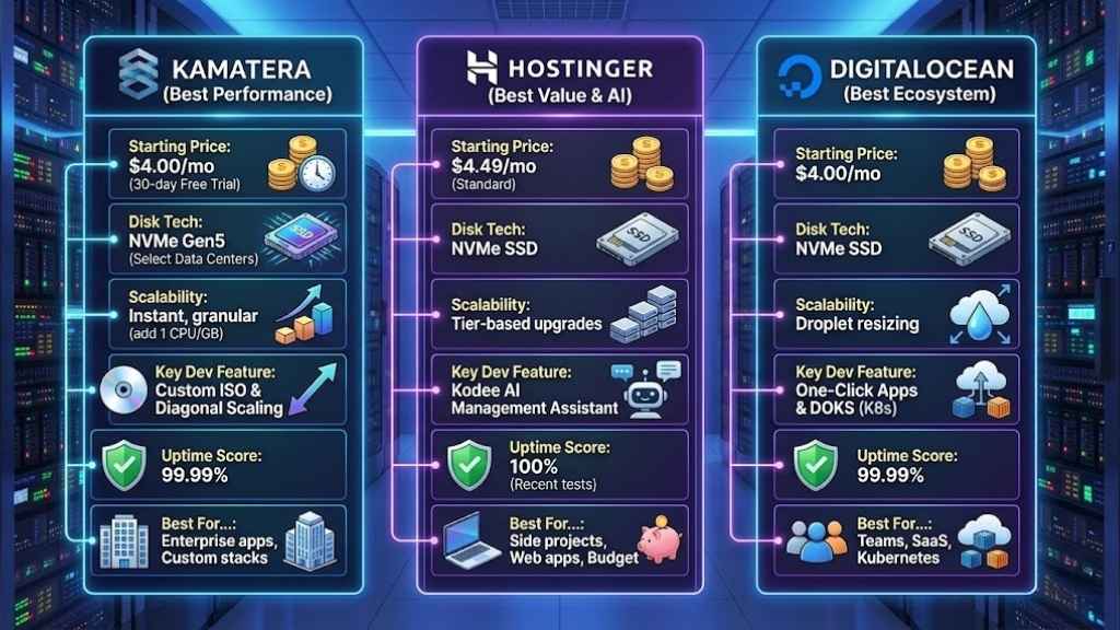 Feature Kamatera (Best Performance) Hostinger (Best Value & AI) DigitalOcean (Best Ecosystem)