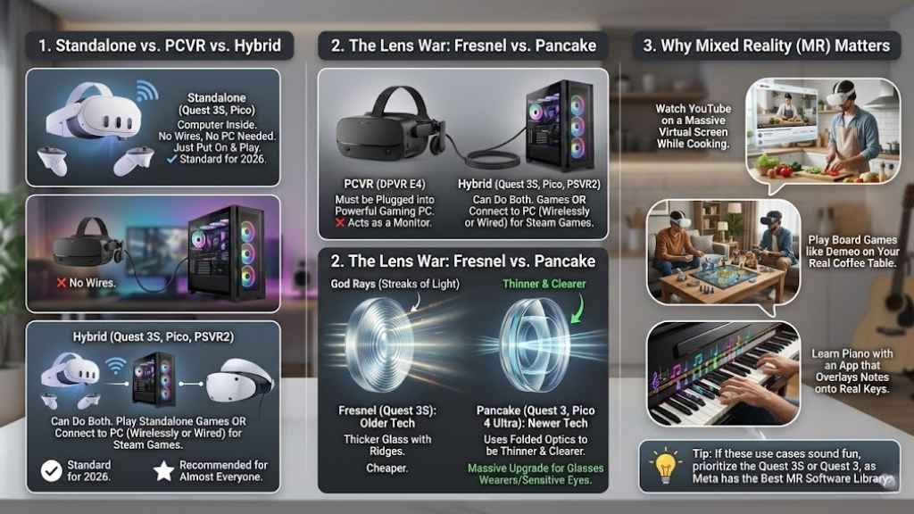 • Standalone (Quest 3S, Pico): Has a computer inside. No wires, no PC needed. You just put it on and play. Standard for 2026.