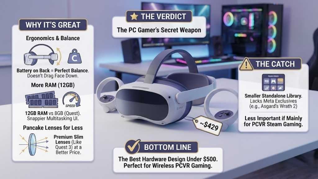 • Best for PC Gamers: Pico 4 Ultra (~$429) – Better balance and lenses than Meta.