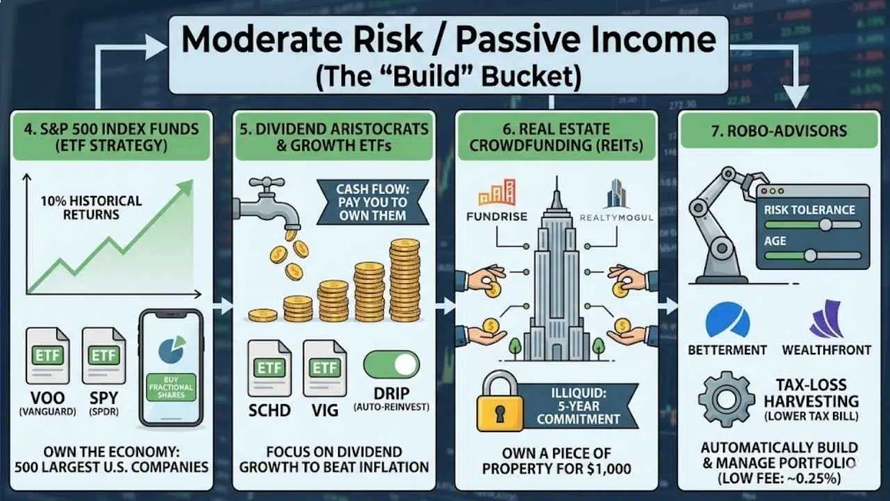 Moderate Risk / Passive Income (The “Build” Bucket)