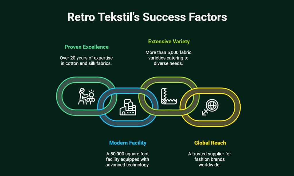 Retro Tekstil stands as a top fabric supplier in Istanbul’s bustling textile district, with over 20 years of proven excellence in cotton and silk materials. Their modern facility spans 50,000 square feet and houses more than 5,000 fabric varieties, making them a go-to choice for fashion brands worldwide.