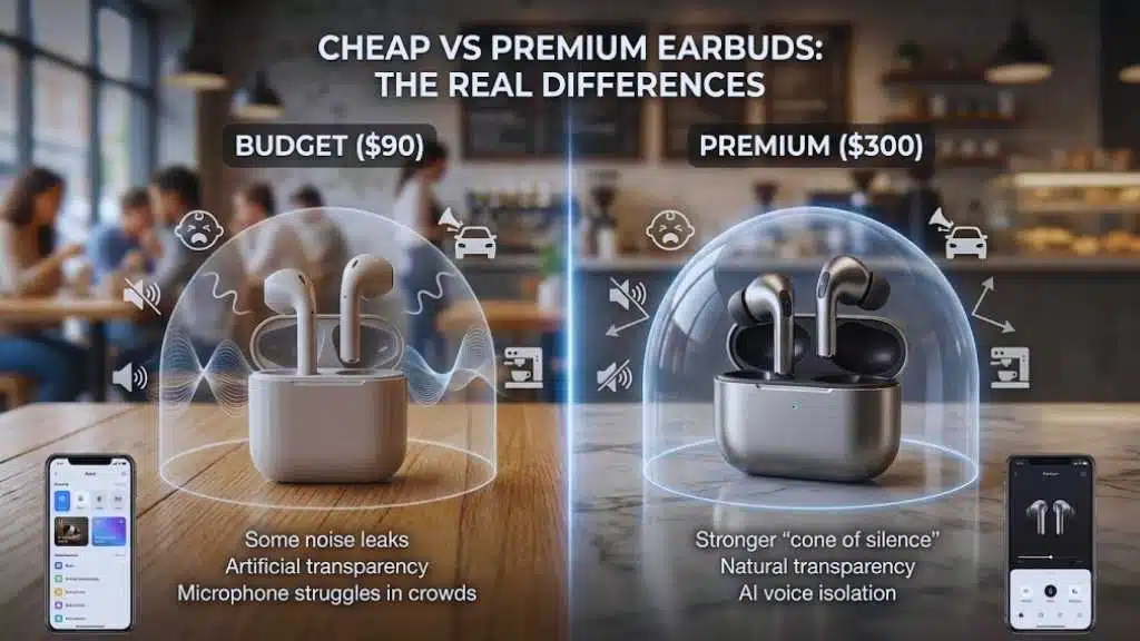 - The “Silence” Floor: Premium earbuds have better processing power to cancel out voices and sudden noises. The “cone of silence” is much stronger on flagship models.