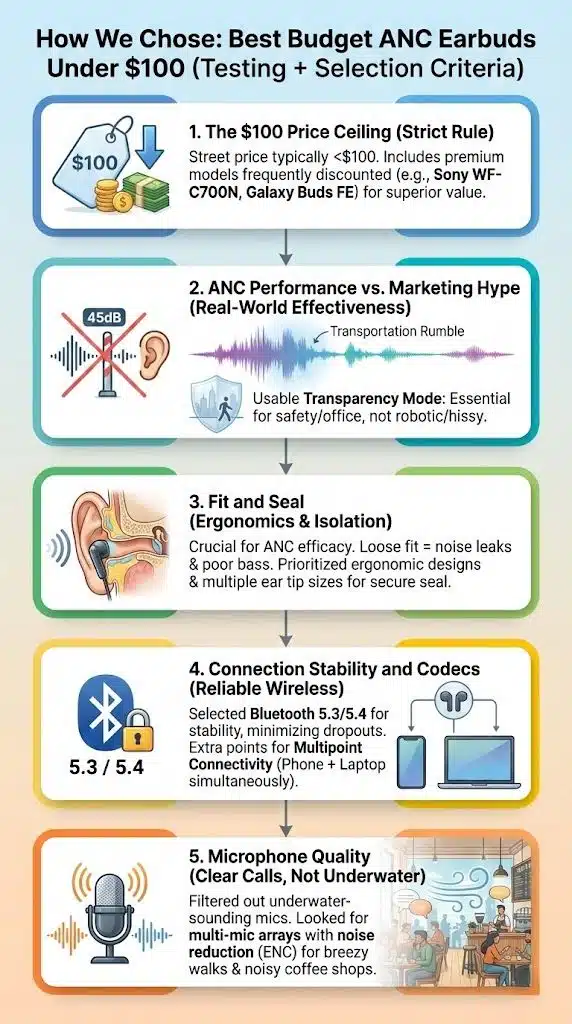 We have capped our selection strictly at $100 (street price), ensuring you get legitimate Active Noise Cancellation (ANC), not just passive isolation. At this price point, “good ANC” means effectively cutting out low-frequency drones (planes, traffic) while dampening mid-range conversations. While no budget bud cuts 100% of high-pitched noise, the models below get surprisingly close when you get a proper ear seal.