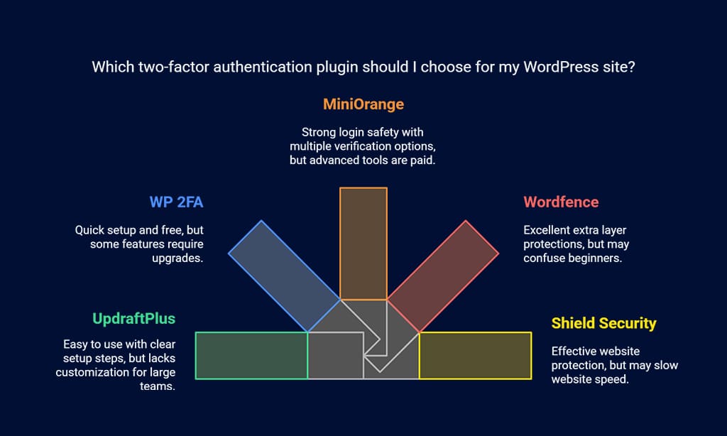 Wordfence Login Security includes excellent extra layer protections. Still, its focus on security features can confuse beginners. Shield Security protects websites effectively but may slow website speed under heavy use. The Two Factor Authentication plugin by UpdraftPlus is easy to use but lacks customization options for large teams or businesses.
