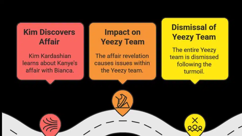 According to Auvray and other staffers, Kim Kardashian had allegedly discovered Kanye’s affair with Bianca while still married to him. This revelation reportedly led to the dismissal of the entire Yeezy team.