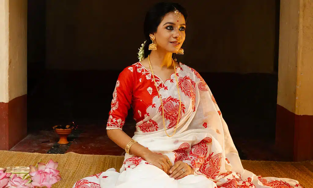 - Dhakai Sarees: Originating from Dhaka, these sarees are known for their delicate embroidery and light material, making them an exquisite choice for Bijoya Dashami. Dhakai sarees, especially in white with red borders, have become iconic for Durga Puja and Bijoya Dashami celebrations.