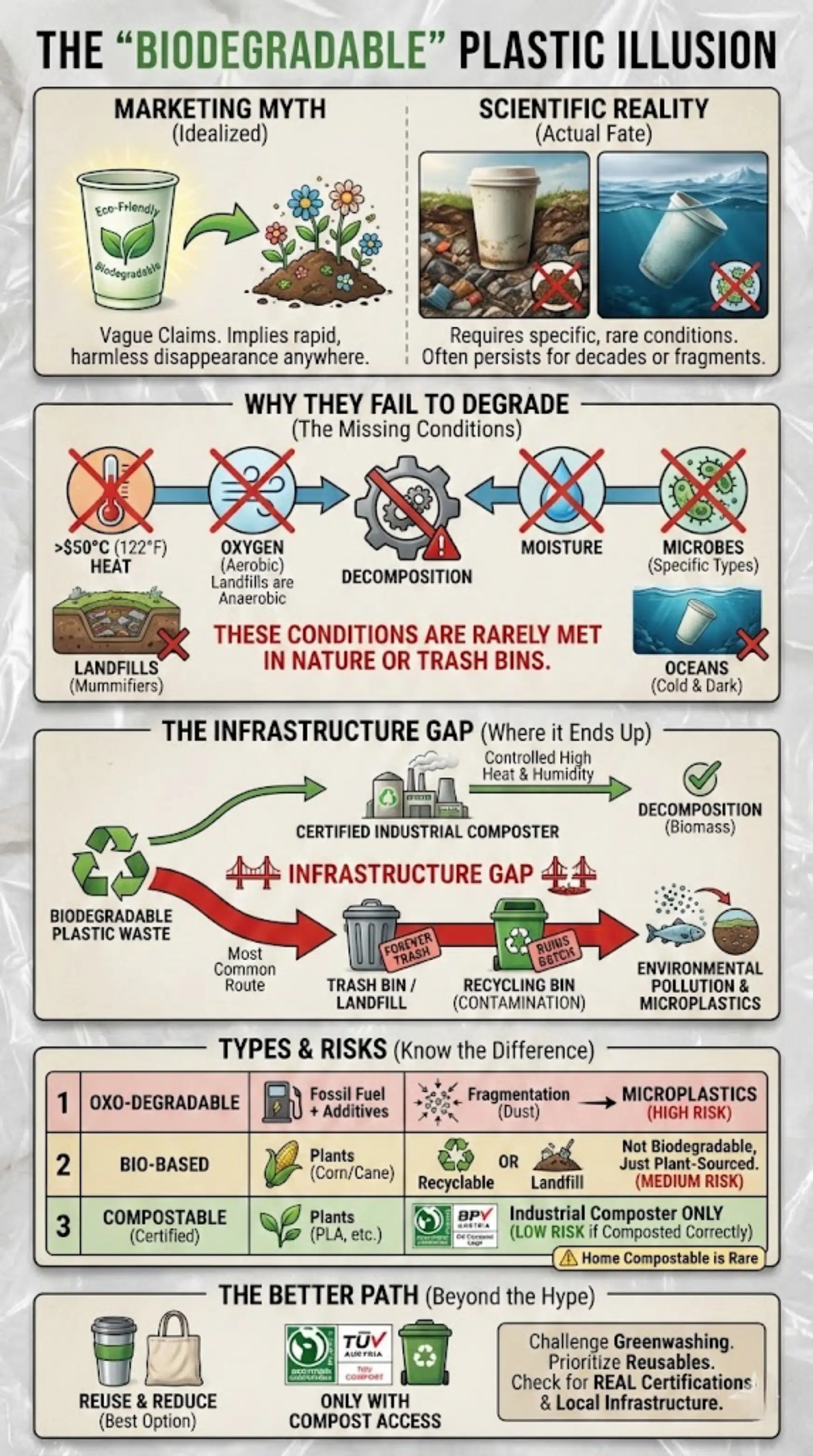 - Marketing Myth: Brands imply that “biodegradable” means the item will vanish in weeks or months, regardless of where you throw it. This vague usage is the core of the biodegradable plastics truth controversy.