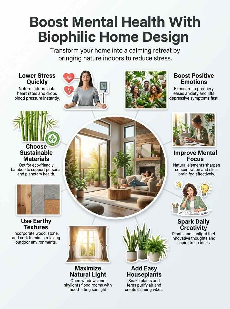 Biophilic design brings nature indoors, cuts stress, boosts mood, sharpens focus, and sparks creativity in your home. You can start small, like adding a few plants or letting in more sunlight, and see quick results without much hassle.