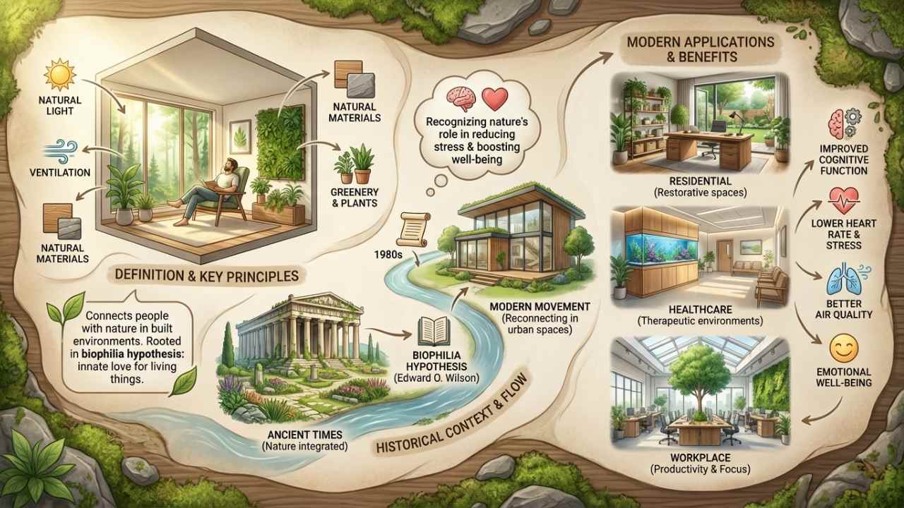 Biophilic design connects people with nature in built environments. This approach draws from the biophilia hypothesis, which says humans crave links to the natural world. Think of it as bringing the outdoors inside your home, like adding plants or natural materials to spark that innate bond.