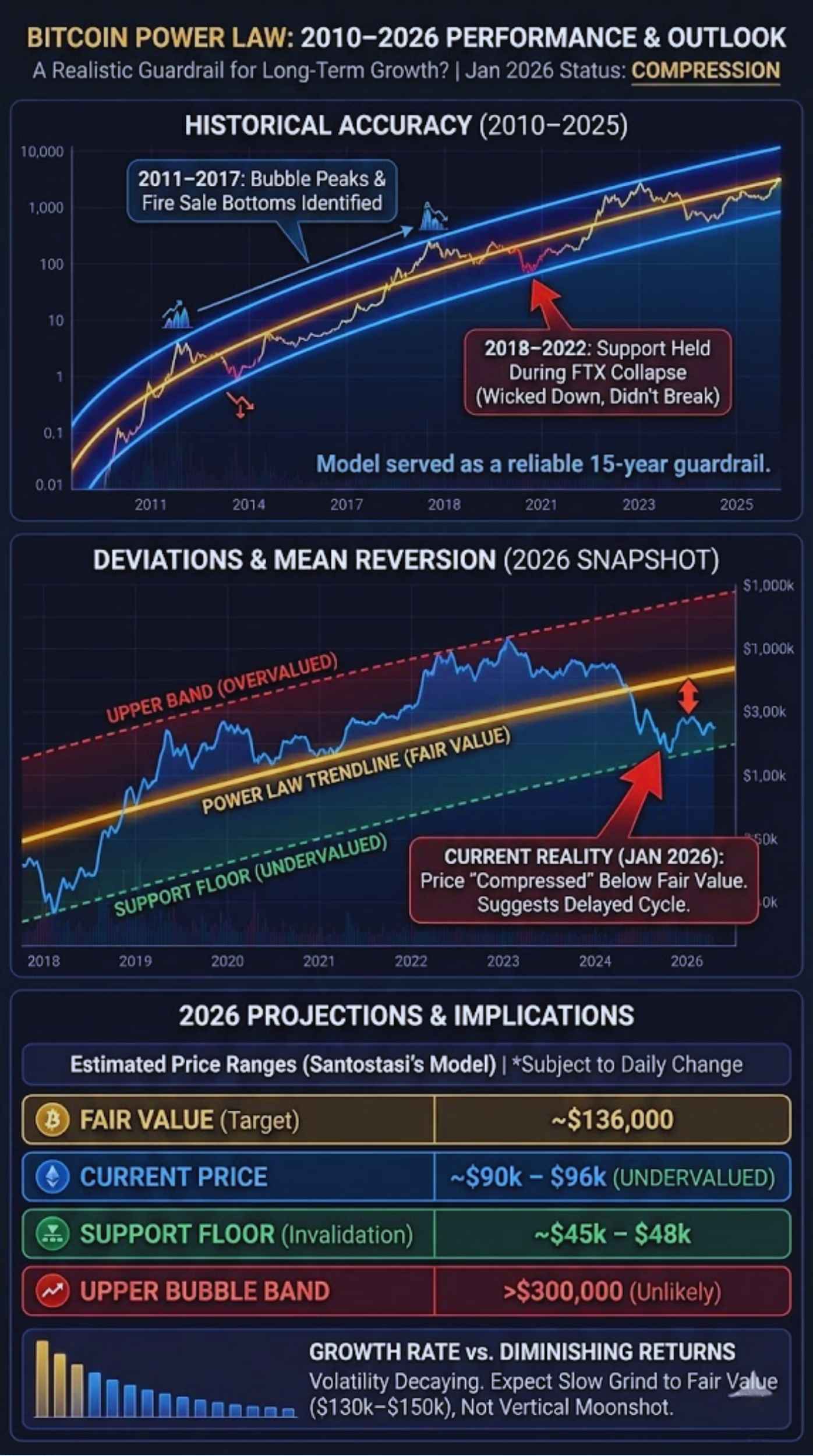 • Current Status (Jan 2026): Bitcoin is trading around $90,000–$96,000, which is below the Power Law’s projected “Fair Value” of ~$136,000.