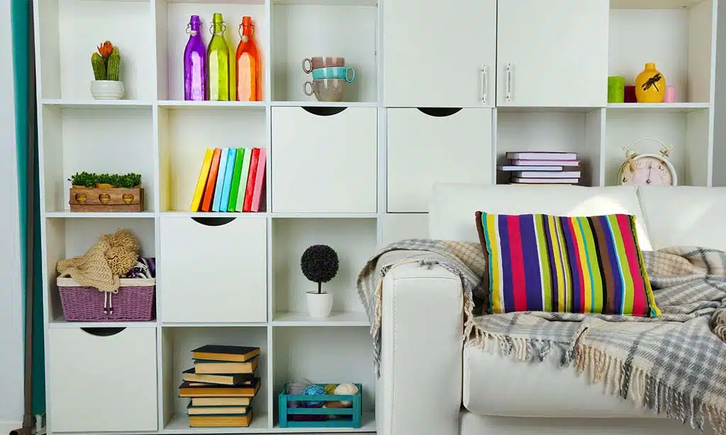 Small pops of color work best, like a bright orange bowl or a pink ceramic figure. Place colored items at different heights to draw the eye across your shelves.