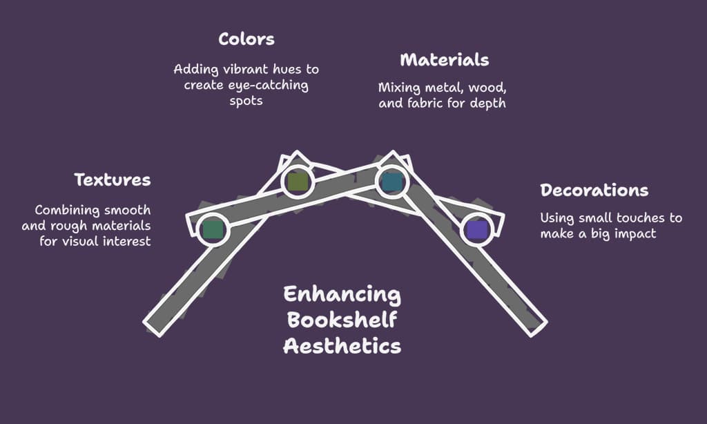 Textures bring life to your bookshelf display. Mix smooth glass vases with rough ceramic pots for visual pop. Add natural wood pieces next to shiny metal frames. Place soft fabric-bound books beside sleek marble bookends.