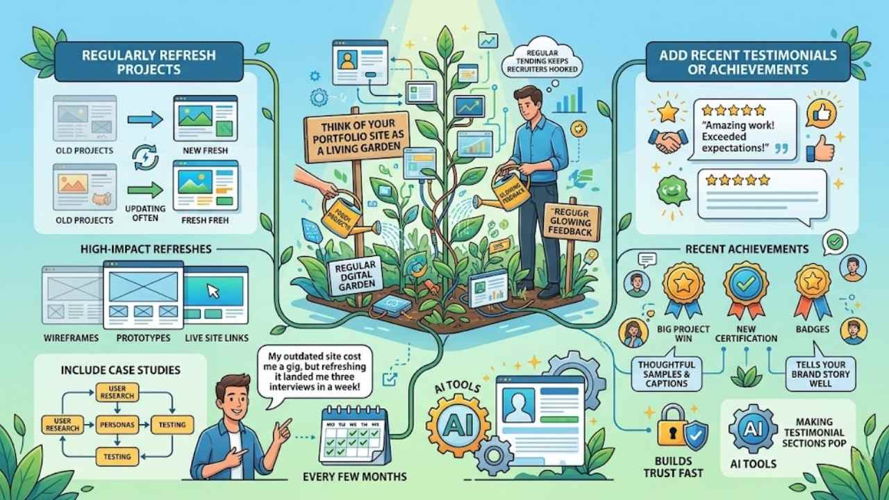 Think of your portfolio site as a living garden that needs regular tending, so swap in fresh projects, toss in glowing client feedback, and sprinkle on new wins to keep recruiters hooked and coming back for more—stick around to uncover how this simple habit lands you that dream gig.