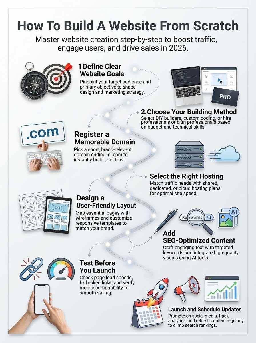 Key Steps Start by defining clear goals, like showcasing work or selling products. Website building in 2026 kicks off with choosing this platform if you crave control. Map out planning, tools, costs, SEO, and common mistakes in your blueprint. Register a domain name early; it’s a critical step.