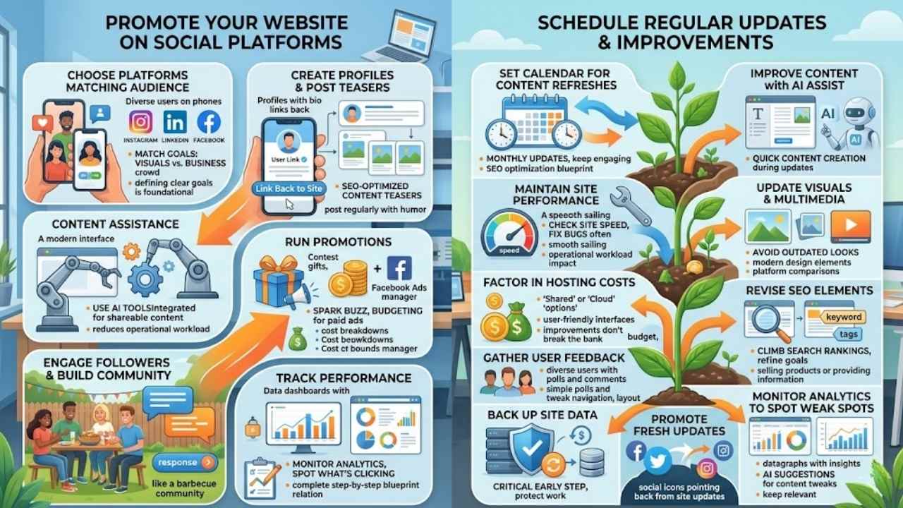 • Share updates regularly, maybe with a dash of humor like, “Hey folks, check out this new post – it’s like coffee for your brain,” since website builders and web hosts have simplified the process through templates and user-friendly interfaces, making promotion feel less like a chore.