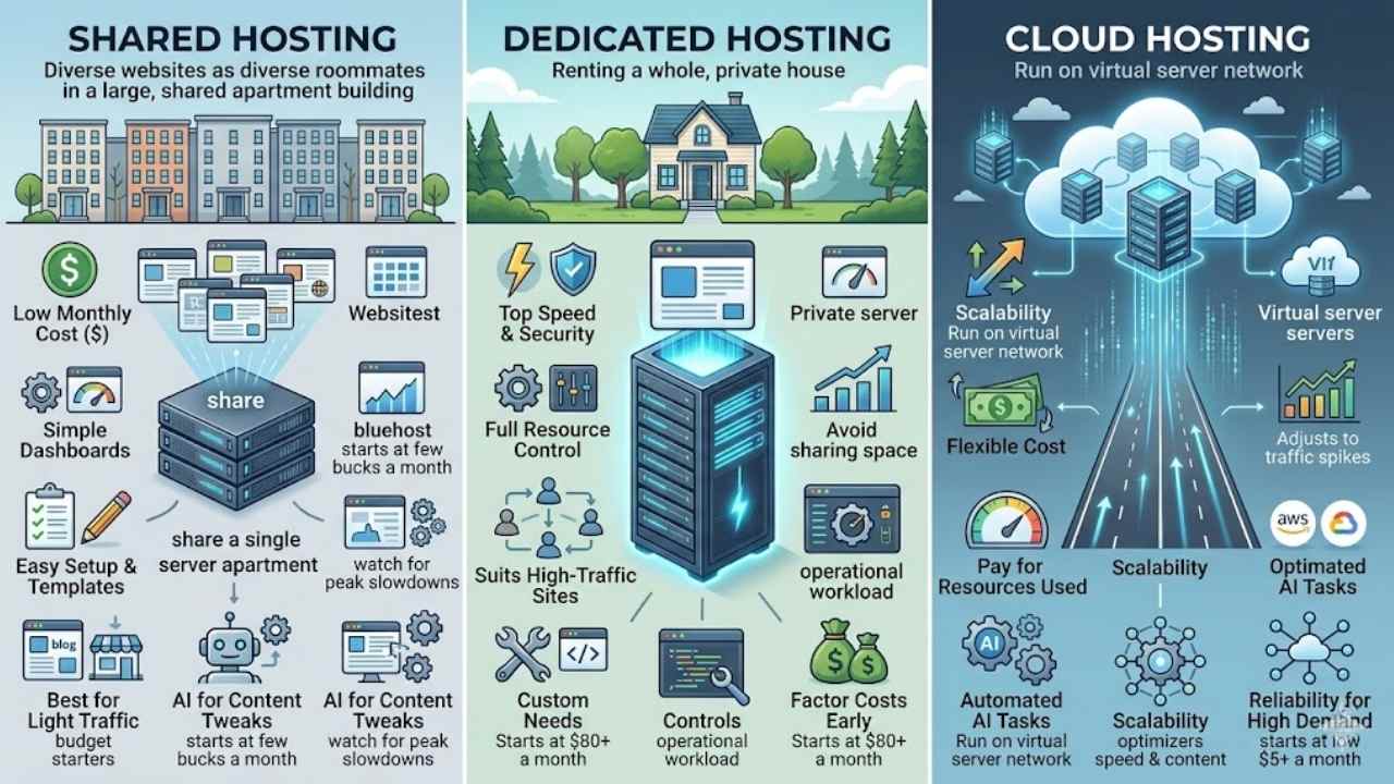 Shared hosting puts your site on a server with other websites, like roommates splitting rent in a big apartment. You all share resources such as space and power, which keeps costs low for starters. Many web hosts, think Bluehost or HostGator, offer this option with easy setups, user-friendly dashboards, and templates that simplify building. It fits well if your traffic stays light, say for a personal blog or small shop. Prices often start at just a few bucks a month, making it a smart pick for budget-conscious folks in 2026.