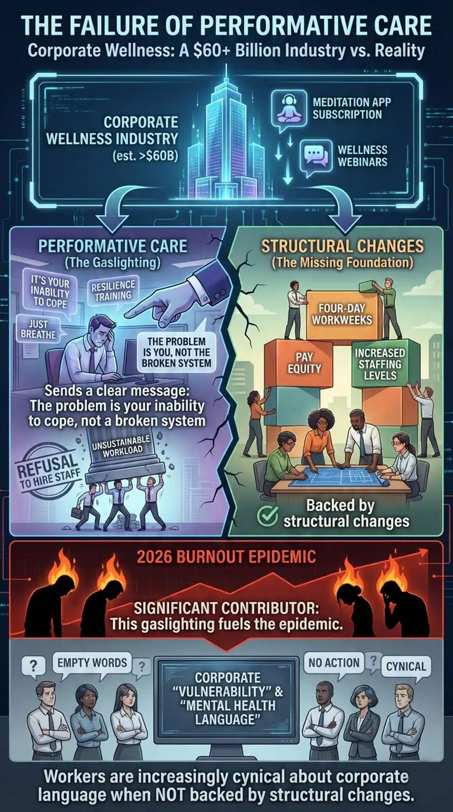 This dynamic deepens burnout by invalidating lived experience. When workers are told to meditate instead of being given manageable workloads, the message received is not care, it is deflection.