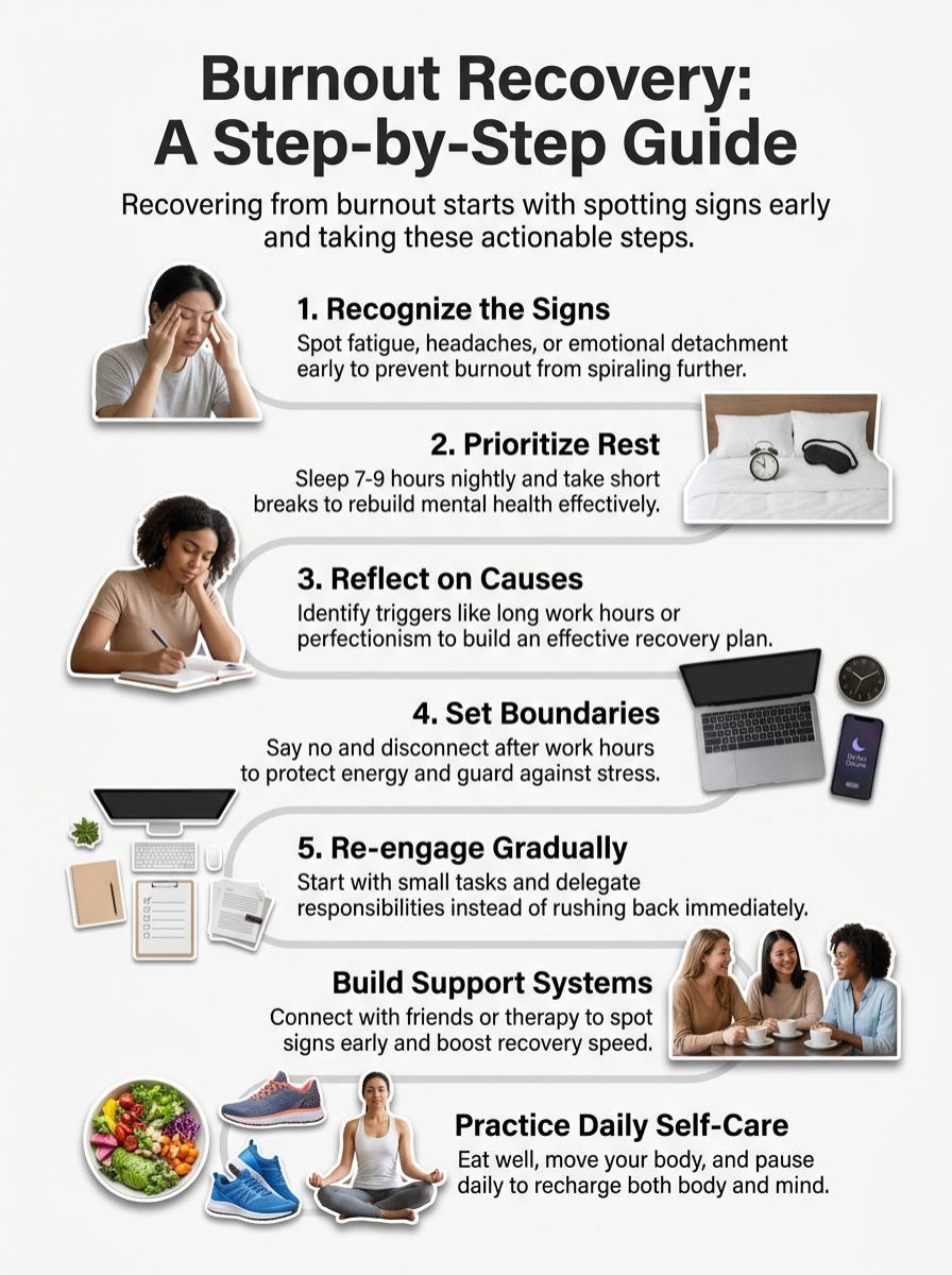 Burnout recovery starts with spotting the early signs, choosing rest, and setting much-needed boundaries. Simple steps like taking short breaks, asking for help, and reflecting on your routine make a real difference.