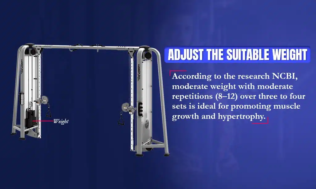 Now, set the appropriate weight. According to the research NCBI, moderate weight with moderate repetitions (8–12) over three to four sets is ideal for promoting muscle growth and hypertrophy.
