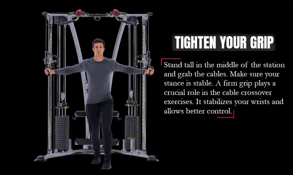 Stand tall in the middle of the station and grab the cables. Make sure your stance is stable. A firm grip plays a crucial role in the cable crossover exercises. It stabilizes your wrists and allows better control.