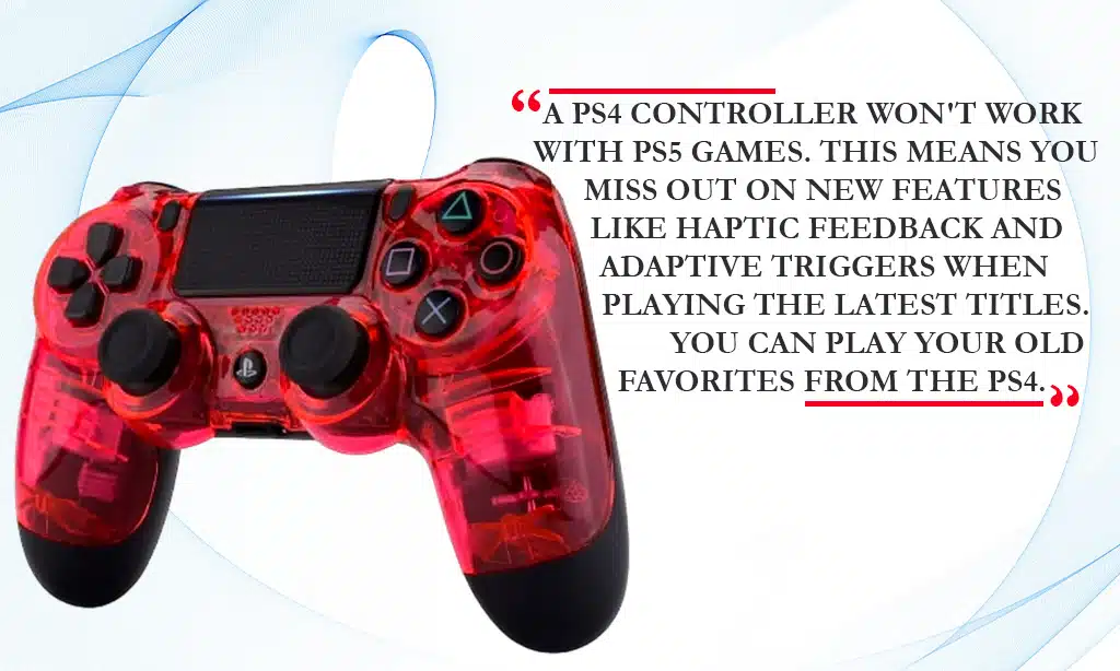 A PS4 controller won’t work with PS5 games. This means you miss out on new features like haptic feedback and adaptive triggers when playing the latest titles. Sony designed these innovations to create a more immersive gaming experience exclusive to the PS5.