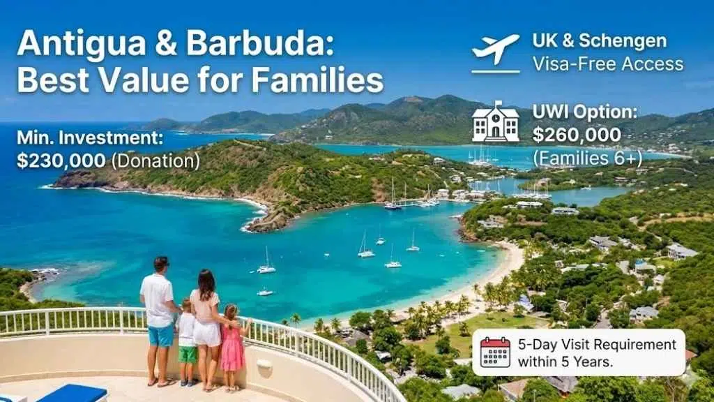 If you are applying as a family of four, Antigua & Barbuda is widely considered the “Goldilocks” option of 2026. While the base price is $230,000, the fee structure for dependents is more generous than its neighbors.