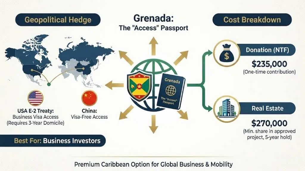 - China Access: Grenada is one of the very few CBI nations with visa-free access to China. For business people trading with Guangzhou or Shanghai, this is invaluable.