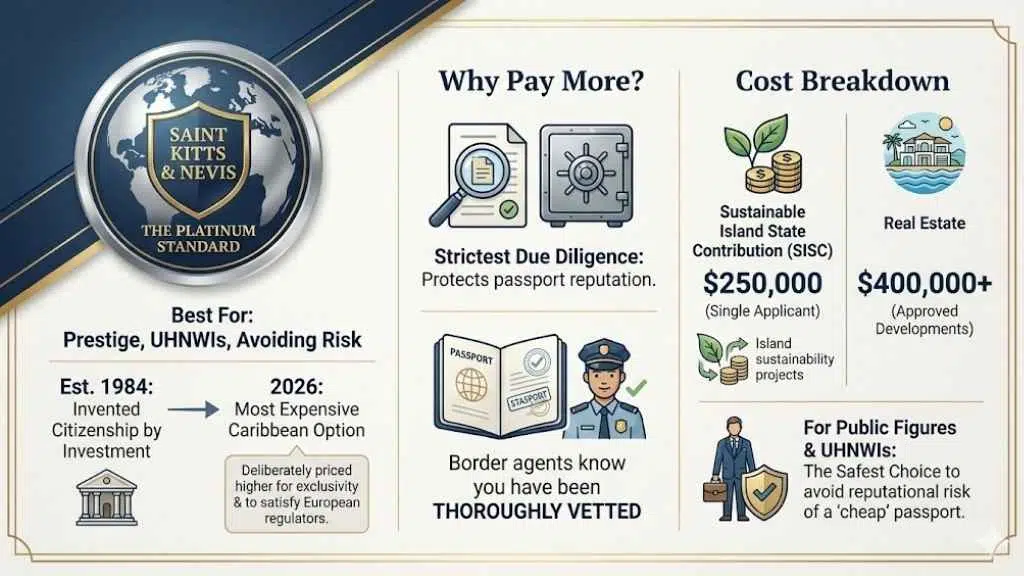 Saint Kitts & Nevis invented the concept of Citizenship by Investment in 1984. In 2026, they are the most expensive Caribbean option, deliberately pricing themselves higher to maintain exclusivity and satisfy European regulators.