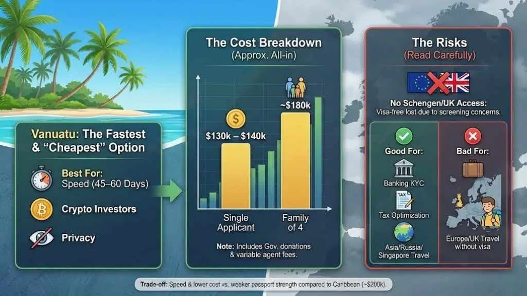 | Vanuatu | ~$130,000 | 1–2 Months | Singapore, Russia | Speed & Crypto |