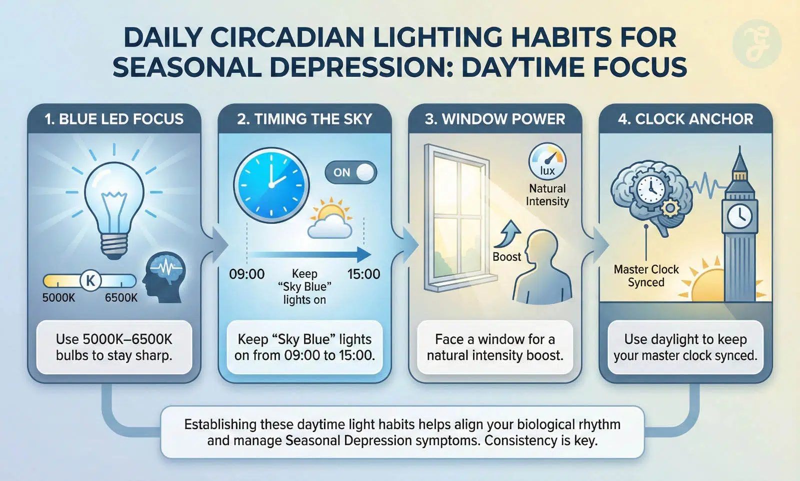 Standard home bulbs are “warm” (2700K). This is great for cozy dinners, but terrible for midday productivity. For your workspace, you want Blue-Enriched LED bulbs (5000K–6500K). Blue light is the specific wavelength that suppresses melatonin most effectively. By keeping your “Sky-Blue” lights on from 9:00 AM to 3:00 PM, you prevent the midday slump that often leads to SAD-related oversleeping.