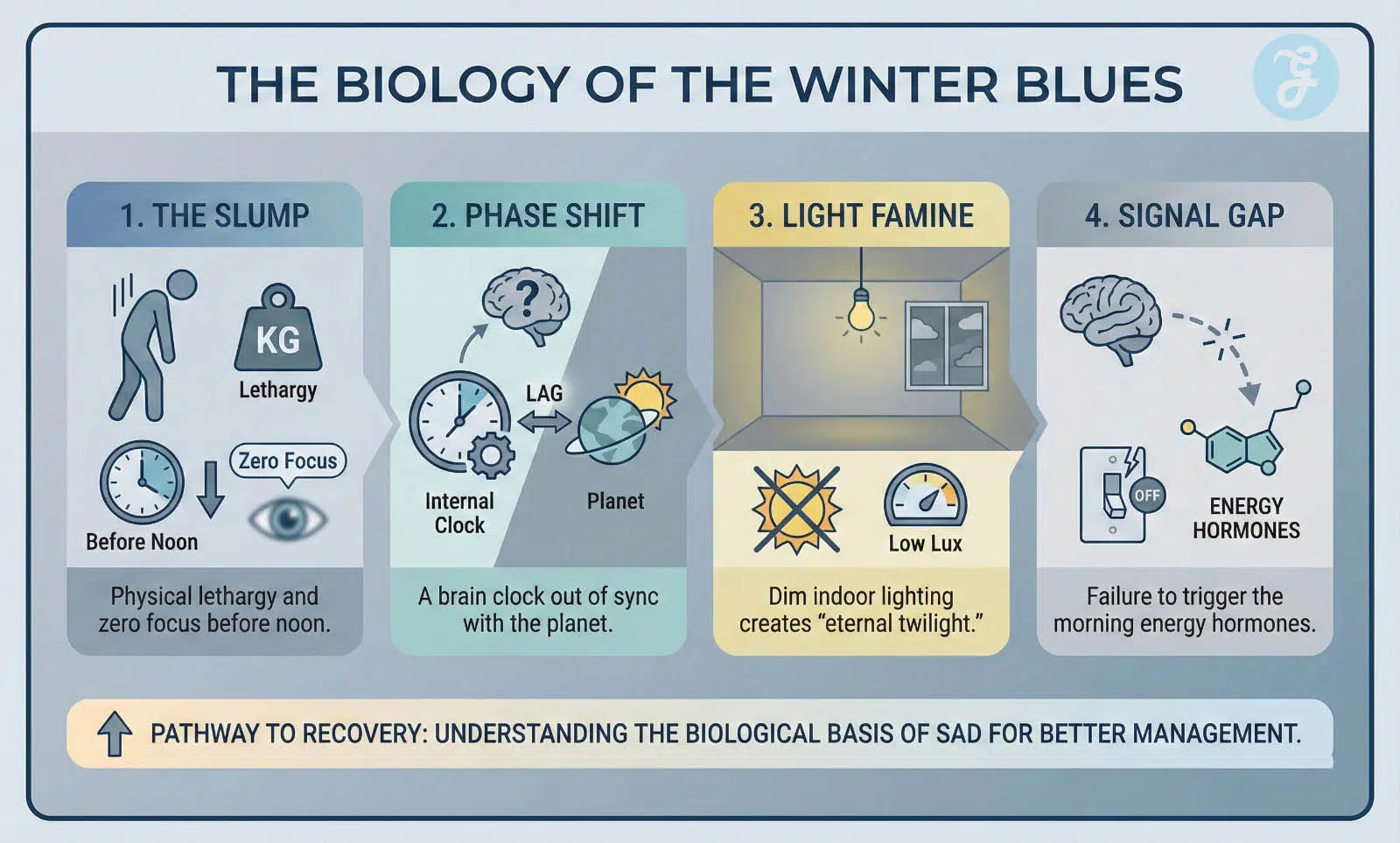 For decades, we thought Seasonal Affective Disorder (SAD) was just about “missing the sun.” Modern chronobiology tells a more complex story. Your brain has a master clock, the Suprachiasmatic Nucleus (SCN), that relies on specific wavelengths of light to produce serotonin (the “feel-good” hormone) and regulate melatonin (the sleep hormone). When the sun vanishes, your SCN gets “phase-delayed.” You are essentially living in a state of permanent jet lag.