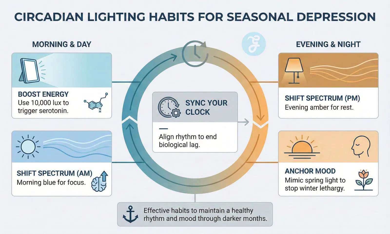 The biggest mistake people make with Circadian Lighting Habits for Seasonal Depression is focusing only on the morning. If you blast yourself with blue light at 9:00 PM, you destroy the sleep quality you need to fight depression.