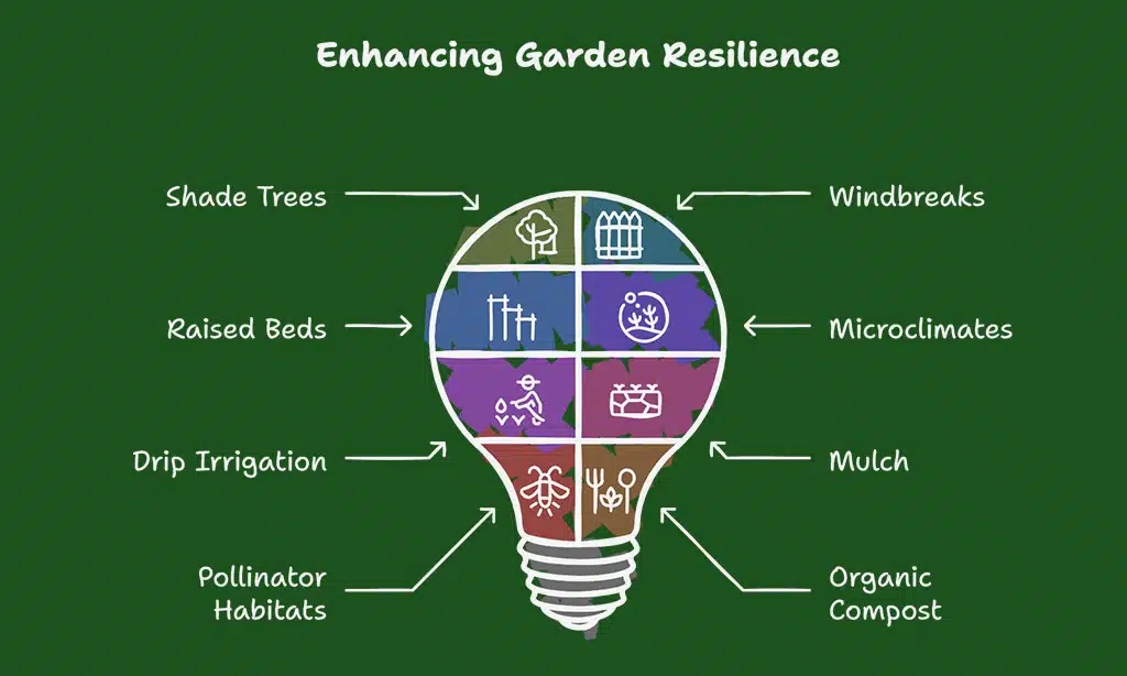 Start with native plants and hardy plants. These handle extreme weather better than most imports. Use raised beds to help soil health, especially if you get heavy rain or drought.