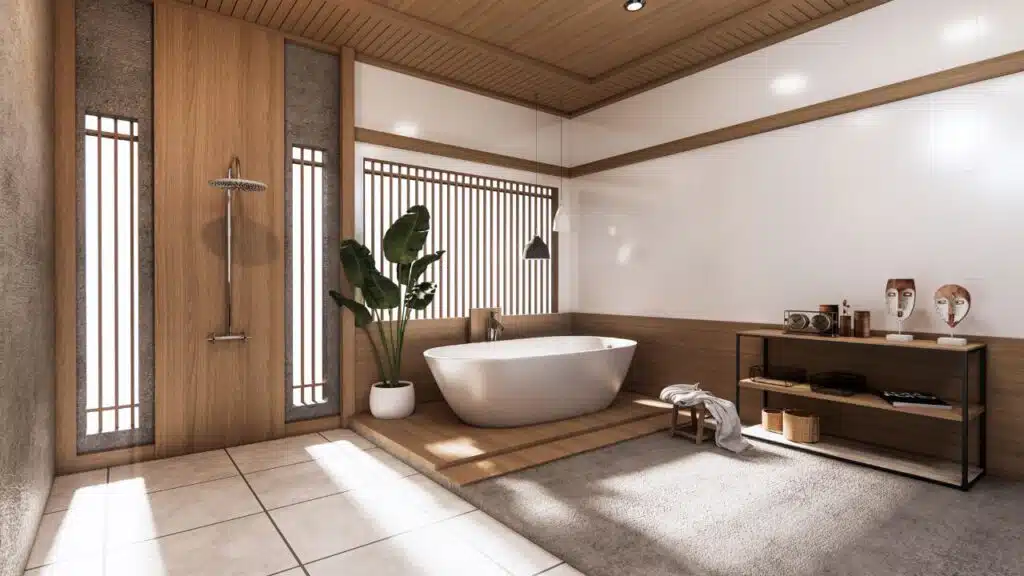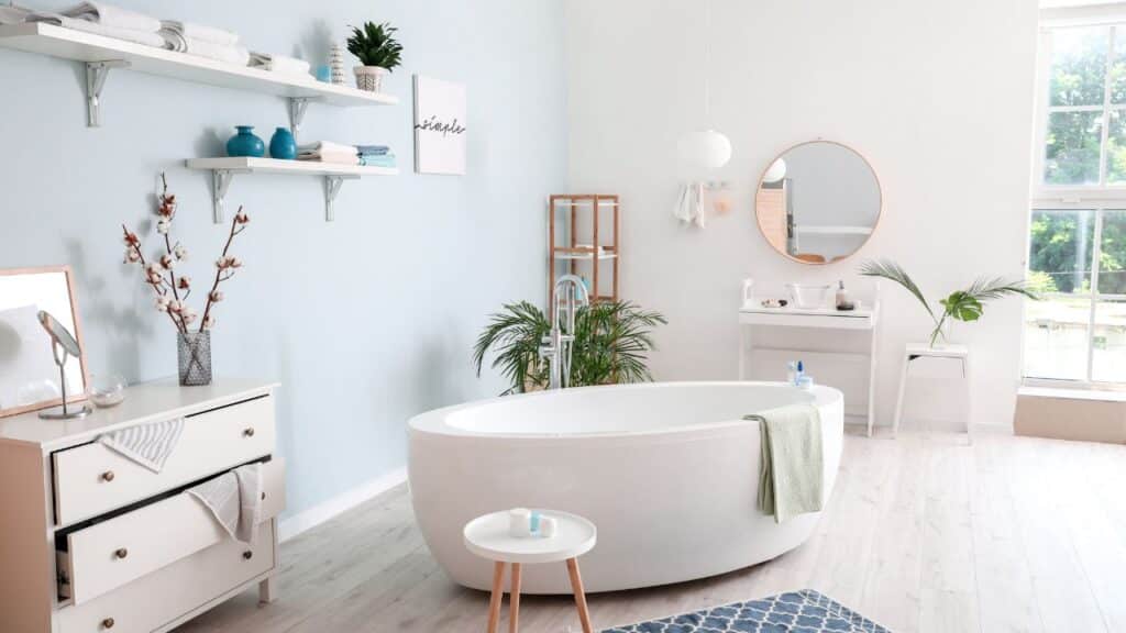 A white freestanding tub stands center stage next to the shelves. Open-concept showers drop heavy doors for a seamless look. Natural air and bright sun fill the room, boosting your mood.