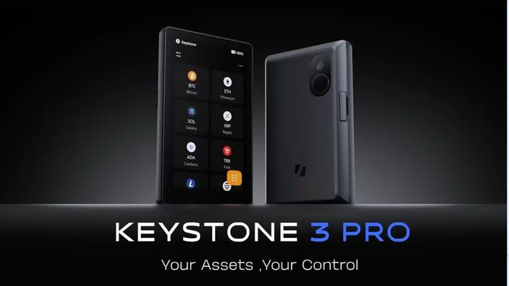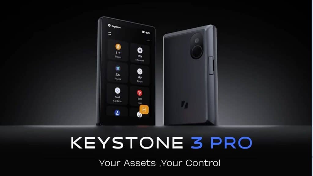 Keystone Pro 3 acts as a cold wallet that locks private keys offline. It uses an air-gap design and a secure element chip to block cyberattacks. Users scan QR codes to sign and verify transactions with no USB or Bluetooth link.