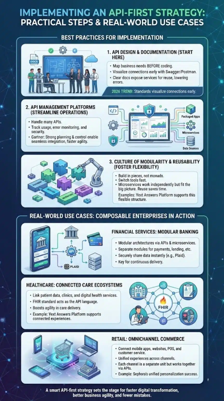Start with clear API design. Teams map out business needs before any code is written. This helps developers, business leaders, and IT professionals work together from the start. In 2026, the most successful companies use standards like Swagger or Postman Collections to visualize these connections early.