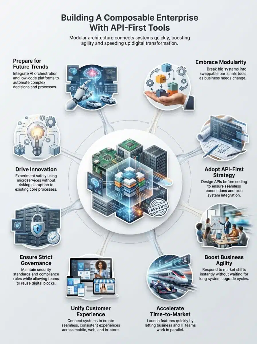 Composable enterprise architecture helps businesses adapt to change instantly. API-first tools and modular architectures support this shift by ensuring every piece of software is designed to connect.