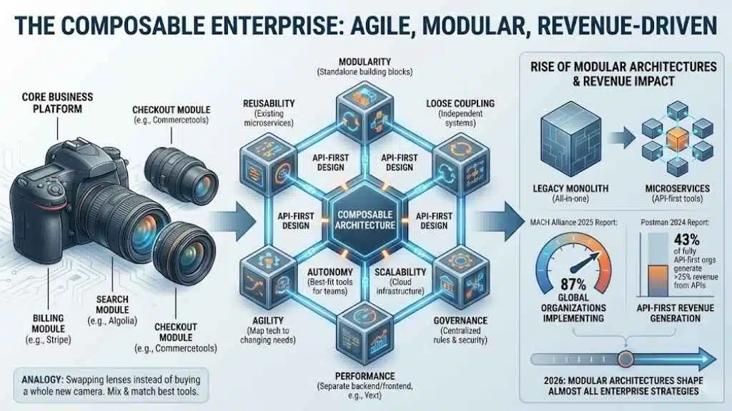 This isn’t just a trend; it’s a survival strategy. Gartner predicts that by 2026, 70% of enterprises will adopt composable technologies to outpace their competition. The reason is simple: speed. Instead of waiting months for a full system update, teams can swap out a billing engine or add a new search feature in days.