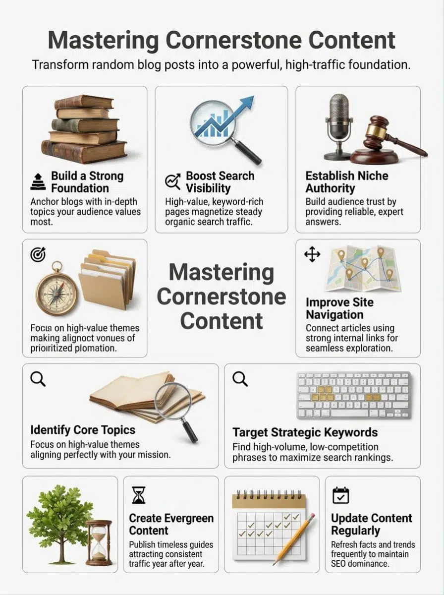 Cornerstone content builds your authority in your niche. It shows that you know your topic well. These articles are often in-depth and focus on high-value subjects. They help readers see you as a trusted source of information.