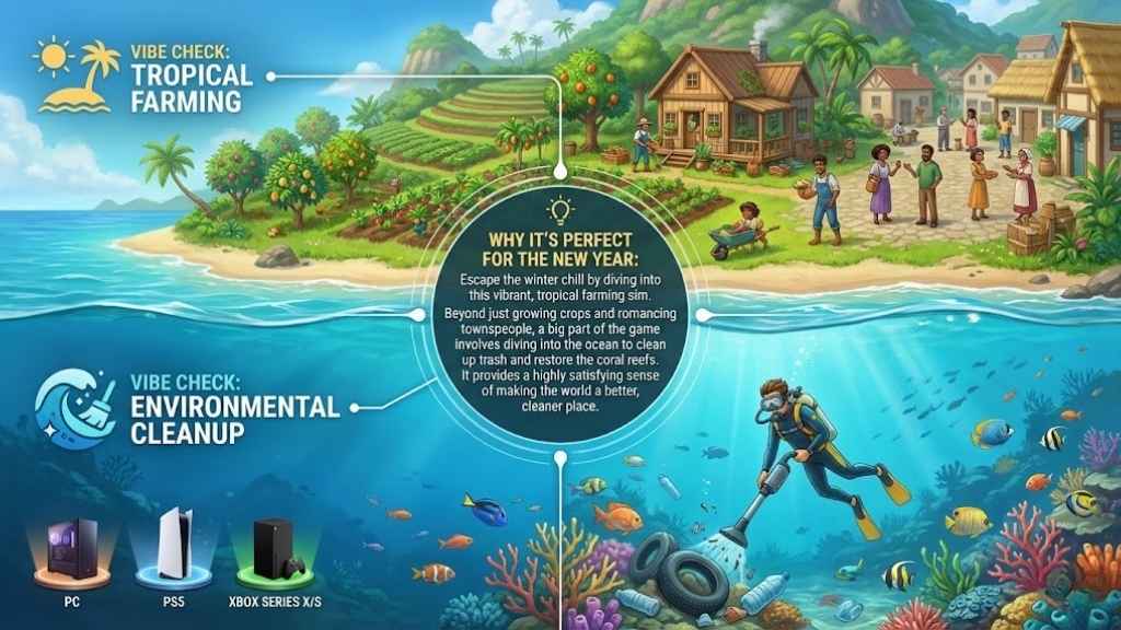 • Why it’s perfect for the New Year: Escape the winter chill by diving into this vibrant, tropical farming sim. Beyond just growing crops and romancing townspeople, a big part of the game involves diving into the ocean to clean up trash and restore the coral reefs. It provides a highly satisfying sense of making the world a better, cleaner place.